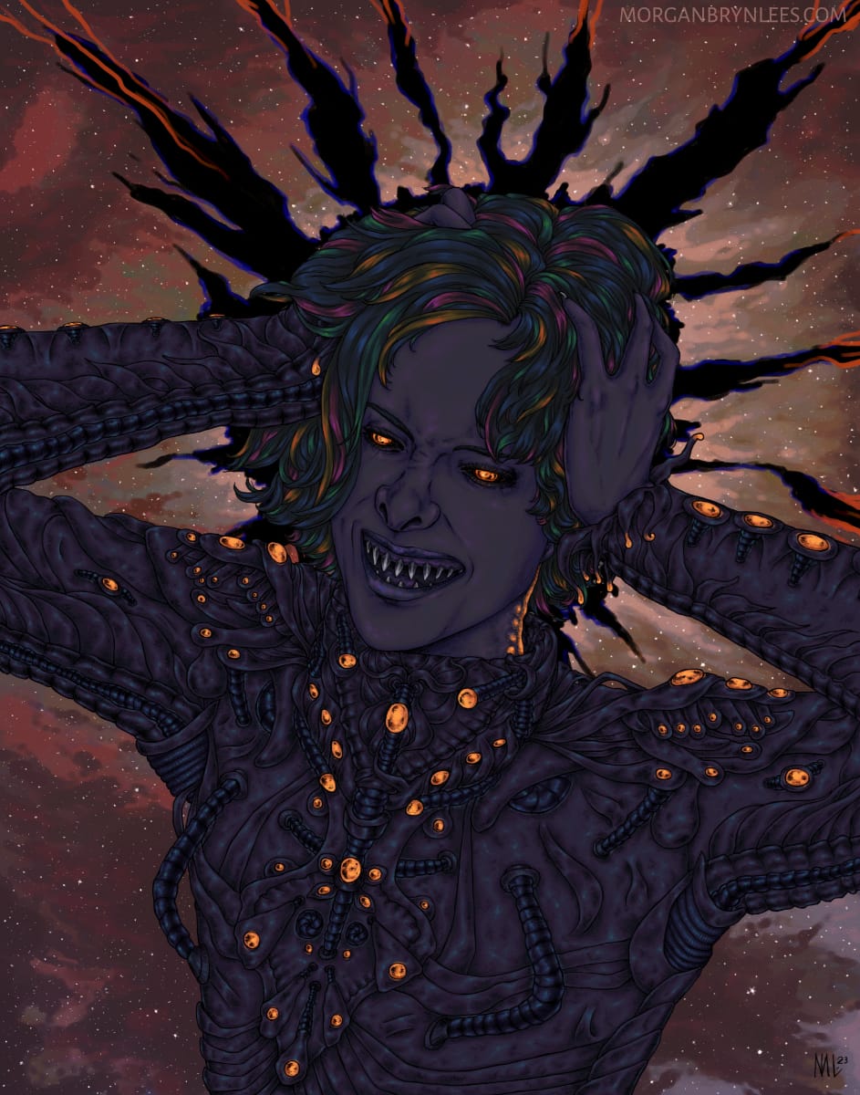 Vexielzethix's end-of-long-running-campaign portrait. He didn't survive the final battle, and was probably my top favorite character, so I did his first.Zor'taj Chaon-ka's end-of-long-running-campaign portrait. He did survive the final battle but chose to continue in the new multiverse only as a dead god, so he was second.