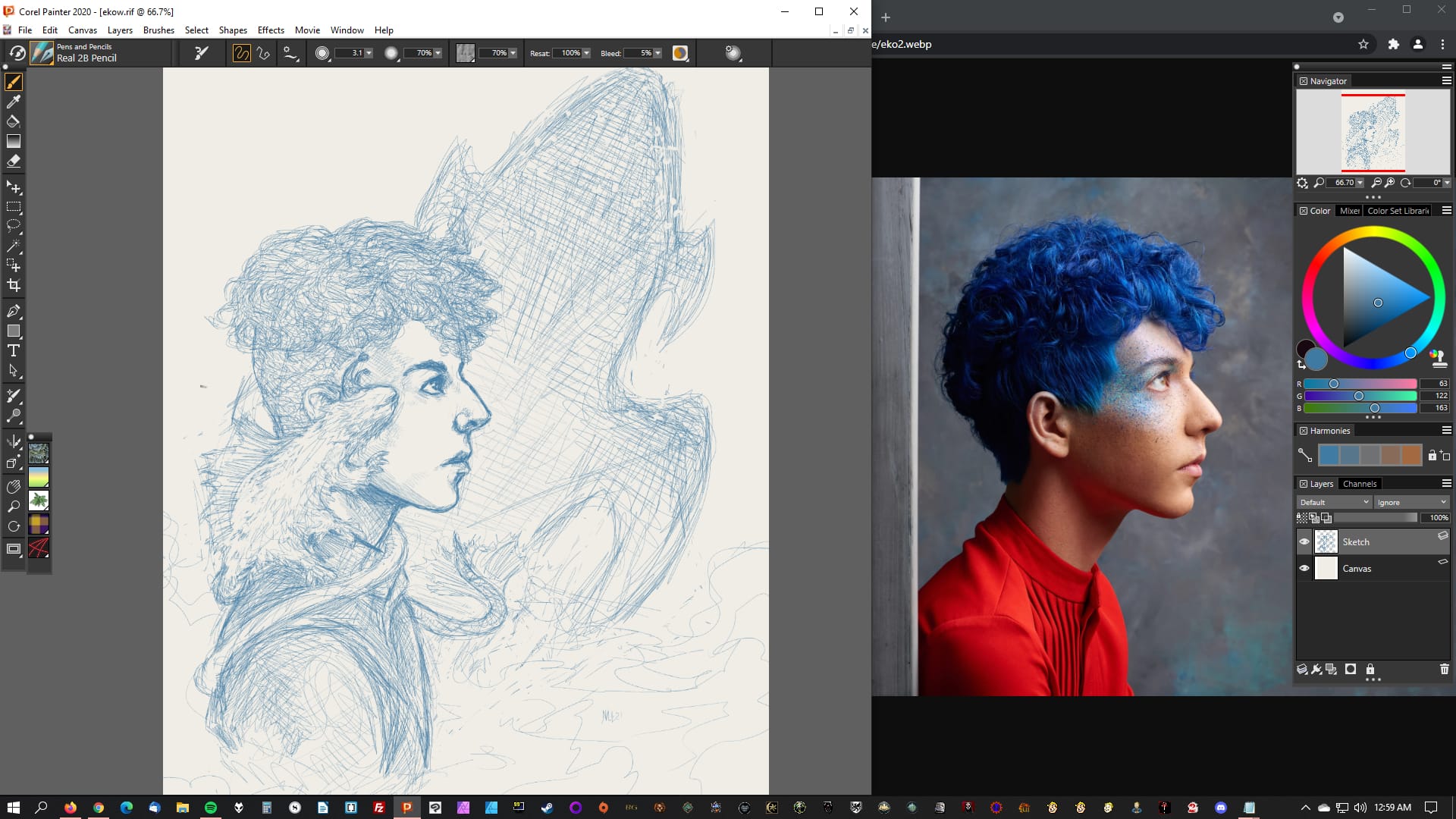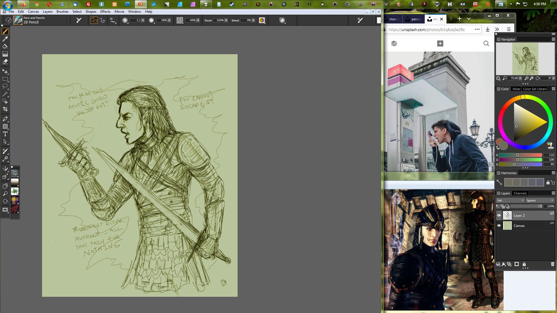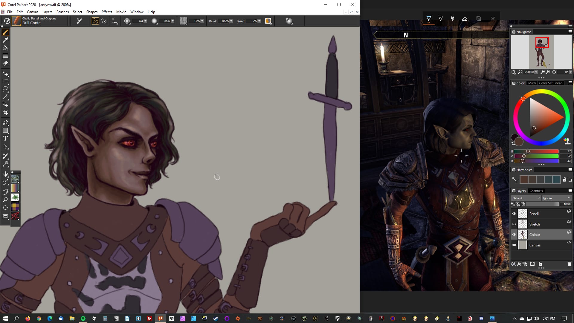 Referencing a screenshot of my Elder Scrolls Online character, Anryn Sarethi; it's been a while, but given when I took this shot, I was probably trying to get the colors right on the Dark Brotherhood armor right at this time, and I would've had a difference reference shot for their face.The sketch is already finished for this drawing of Eko Okano (a character from a short story I've written who appears in the novels I'm working on), but the stock image there was my main reference. I also believe I referenced some pictures of rats on people's shoulders, and maybe a lizard, but this was a few years ago now.This one of Zemariel Tabris (my first Dragon Age: Origins character) actually probably shows what the reference looks like while I'm working the best. There's a stock image for the pose, and then a screenshot compilation of the character which also serves as an armor reference in this case.