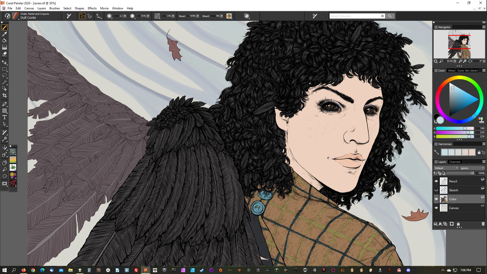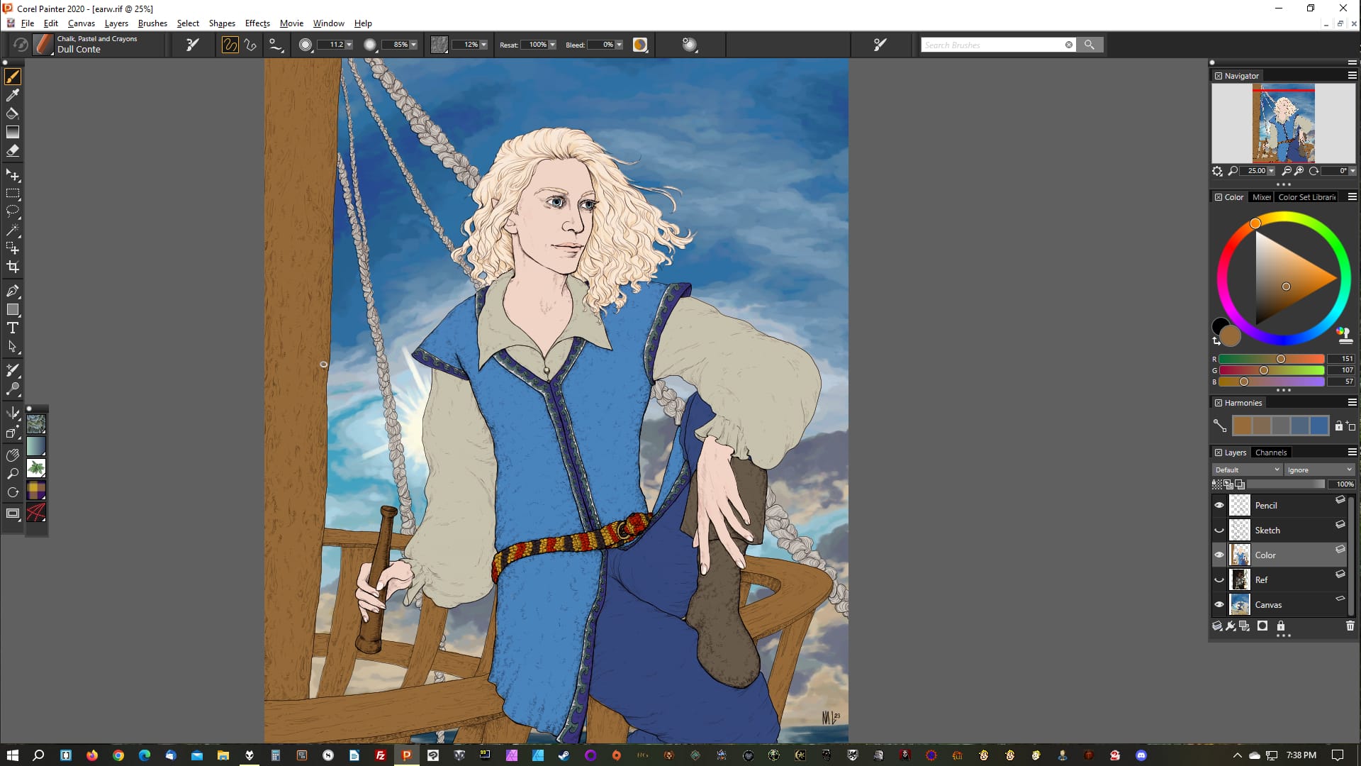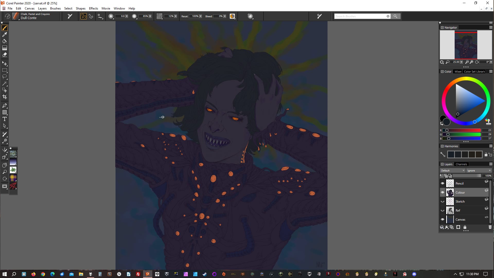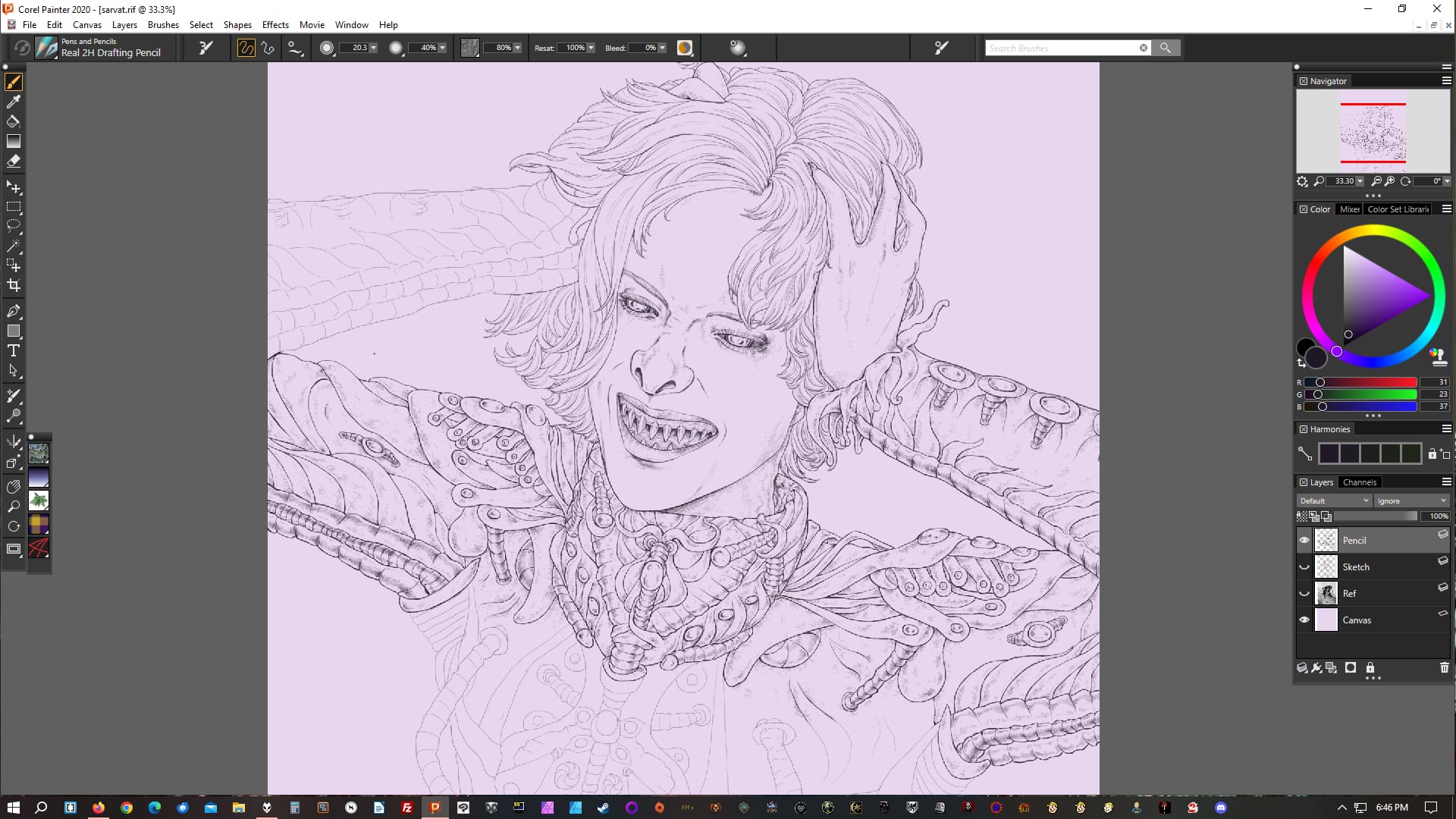 I've changed my standard process since the last time I wrote about it, although mostly in fairly subtle ways. I'm still primarily using Corel Painter for digital art, but after a brief forray into trying to ditch the lines and go full painting, I realized that the linework stage is actually the one I often enjoy the most, so I've focused on that more again.