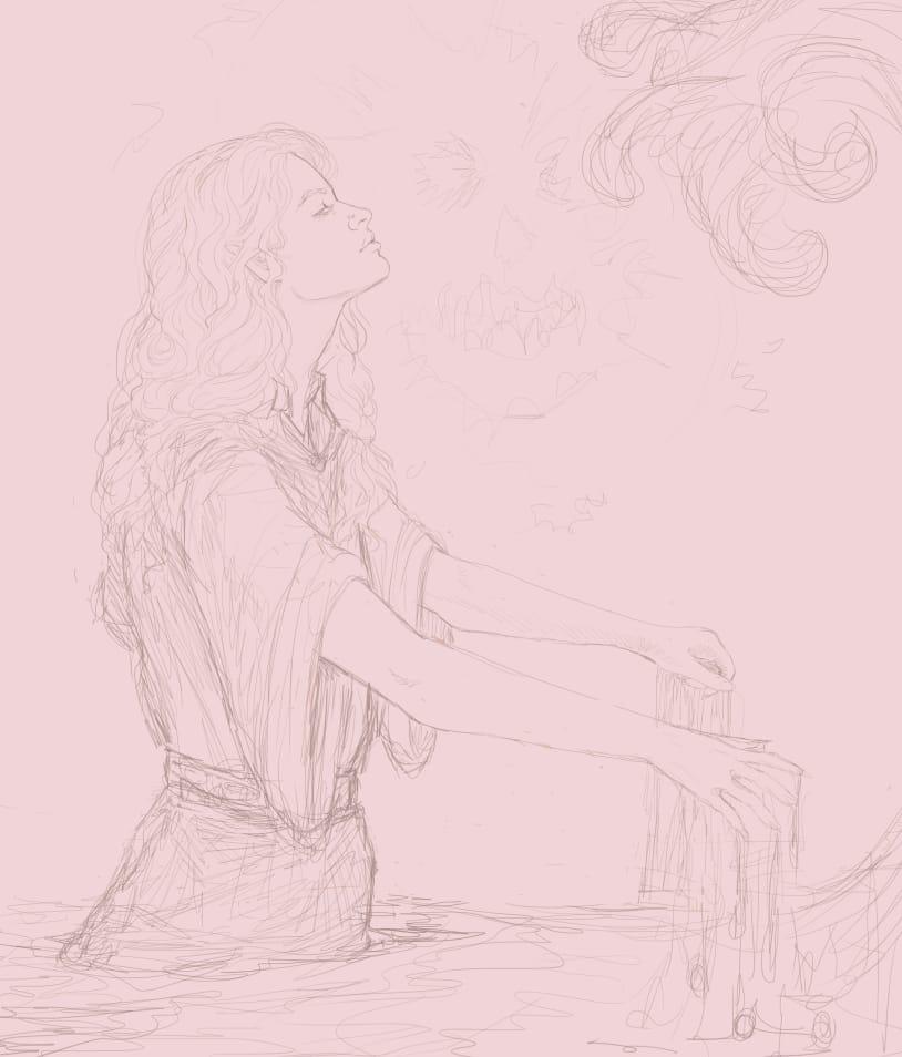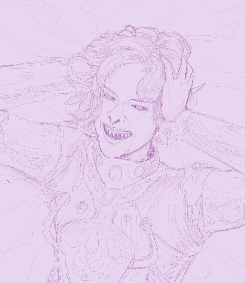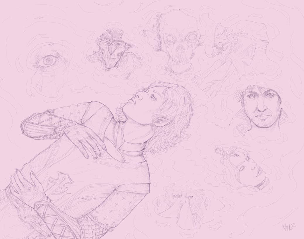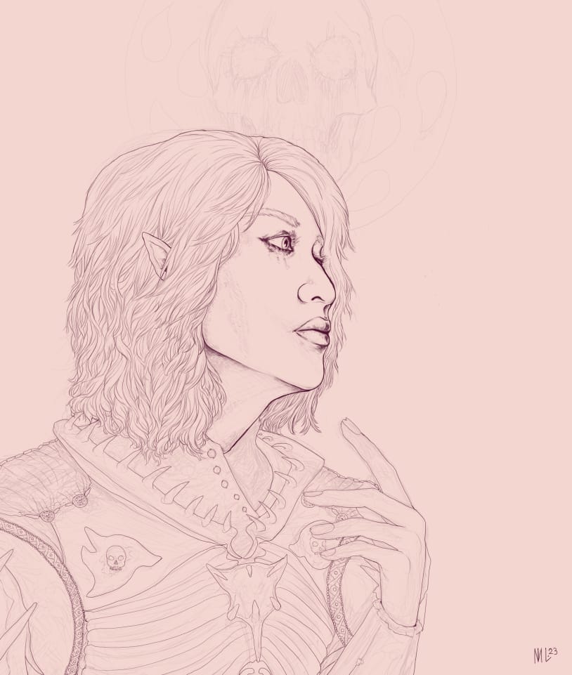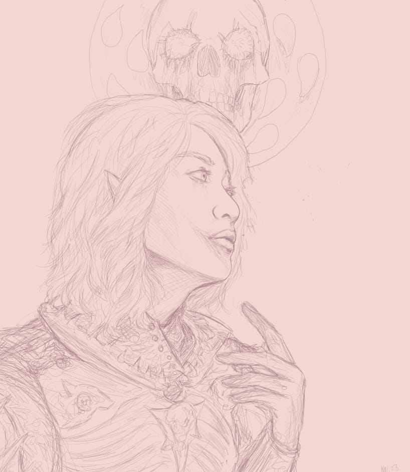 This is from early last year, the sketch for my drawing of Raven O'Malley (my character in a Changeling: the Lost game). There's most information where I feel like I'll need it later, like in their wings and feathery hair, than where I more or less know what I'm doing anyway.This sketch for a recent drawing of Vethryn (one of my Baldur's Gate 3 characters) is one of the more detailed sort. I wanted to be sure what I was doing with his armor as well as with the memory snapshots appearing in the blood.By contrast, this sketch of Ithenrael (my first Baldur's Gate trilogy character) is of the less detailed sort and ended up not having enough information. I changed quite a few things from this point, including his hair, his robe, and the general aspect of the wave of blood. I also decided the symbol of Bhaal faintly in the background just didn't work, which is something I would have known if I'd worked this sketch more.This one (also Vethryn) is about the right amount of detail, I feel; I knew exactly where I was going when I got into the linework, but I didn't get so detailed with the sketch that I almost wished I could just keep parts of it.This sketch for a still-in-progress drawing of Saryan (a character from the novels I'm writing at the moment) has about the right amount of detail around xir face and hands, but I definitely should have nailed down more things about the armored suit at this stage.