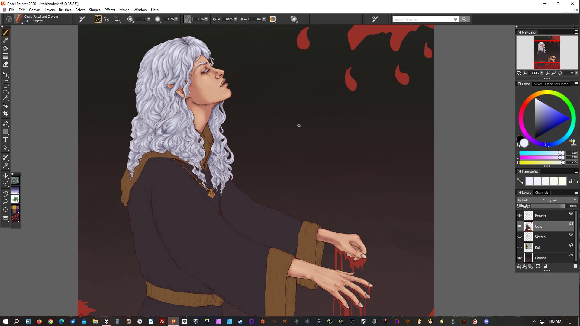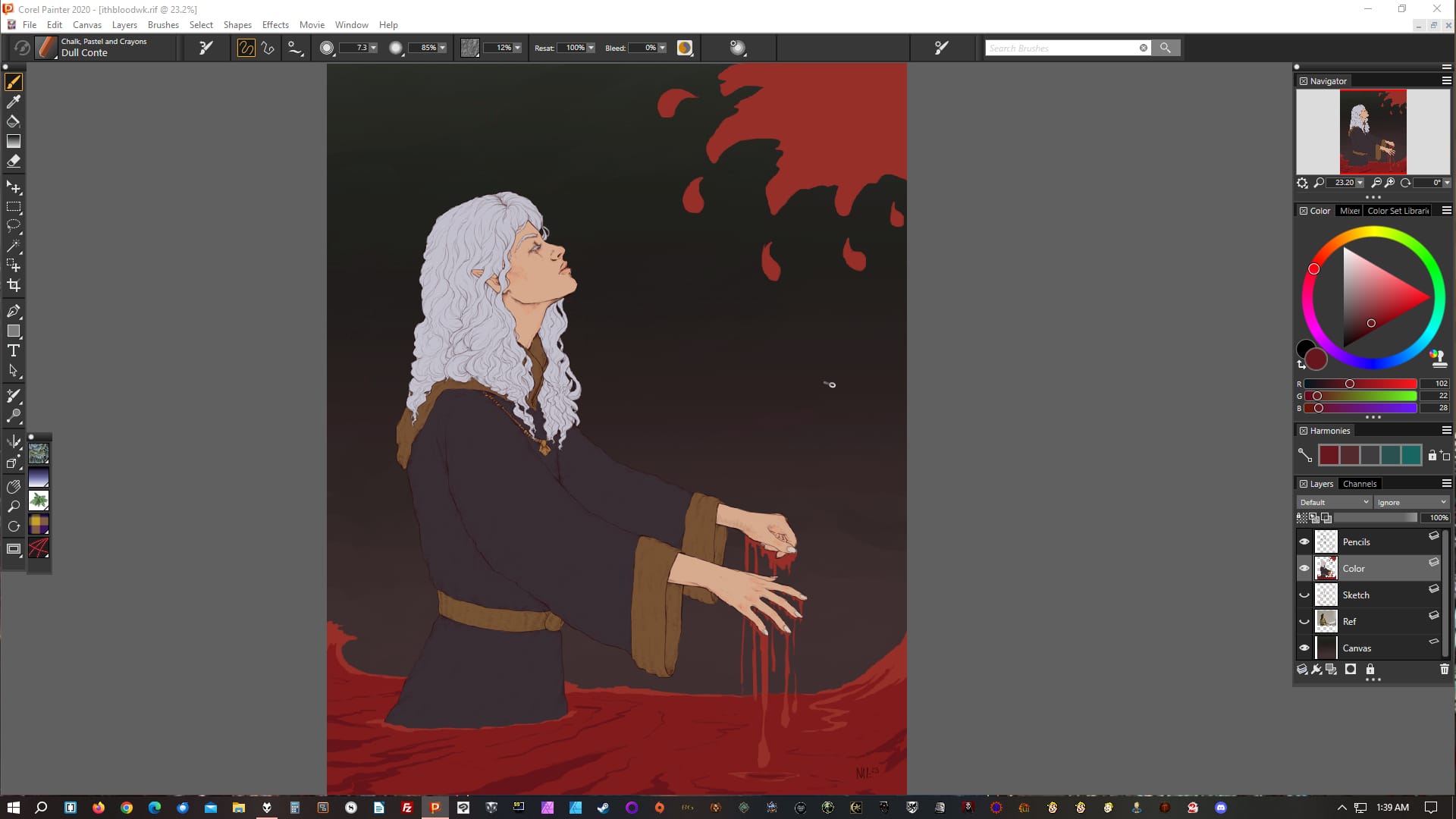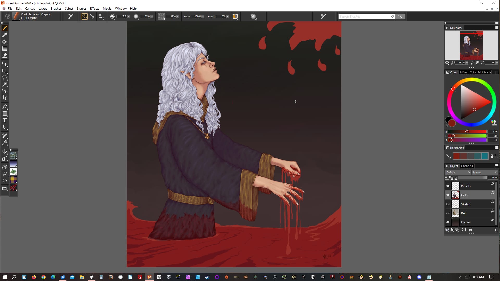 This drawing of Vethryn is at a typical first rendering session end point: his face and hair is done, as is his hand (I have the blood layer off for now), but I've yet to get to anything else.Similarly for the one of Ithenrael here; face and hair done, hands done (I usually do all visible skin at once), nothing else.A bit further on into rendering, in addition to Vethryn's face, skin, and hair, I've also done the leather bits on his armor. I tend to go more by "type of thing" than "section of image".At this point Ithenrael himself is done, but I haven't started in on the blood ocean or blood wave yet. Another common stopping point.Similarly, at this point Vethryn is done, but I haven't begun on the background yet. I didn't take a screenshot of that part of the process; unfortunately for this post, I often don't, because it's the last.I actually worked on the background first in this one of Earilin (one of my MERP characters), so that's a background example. Usually I would have done this last; I don't know why I did it differently here.
