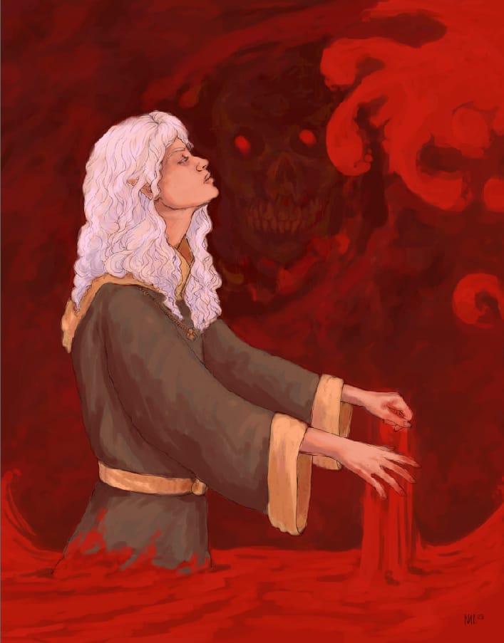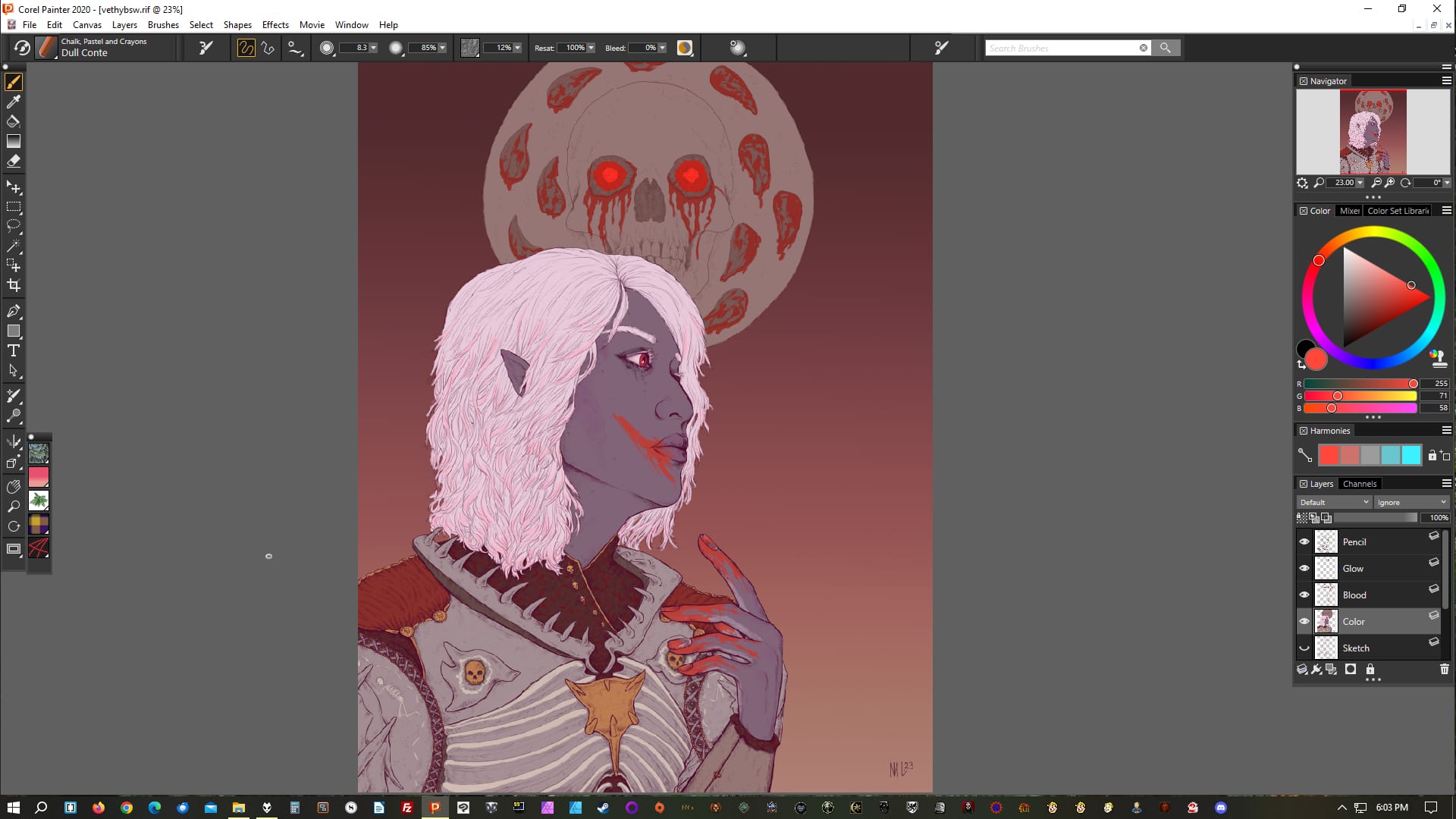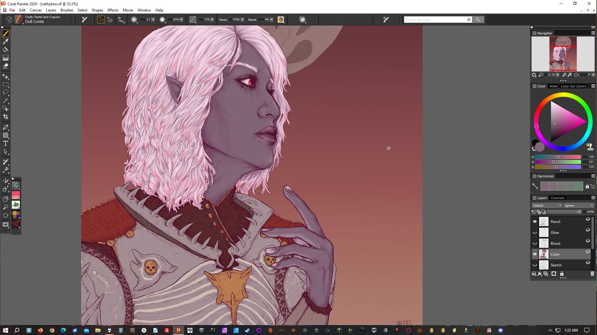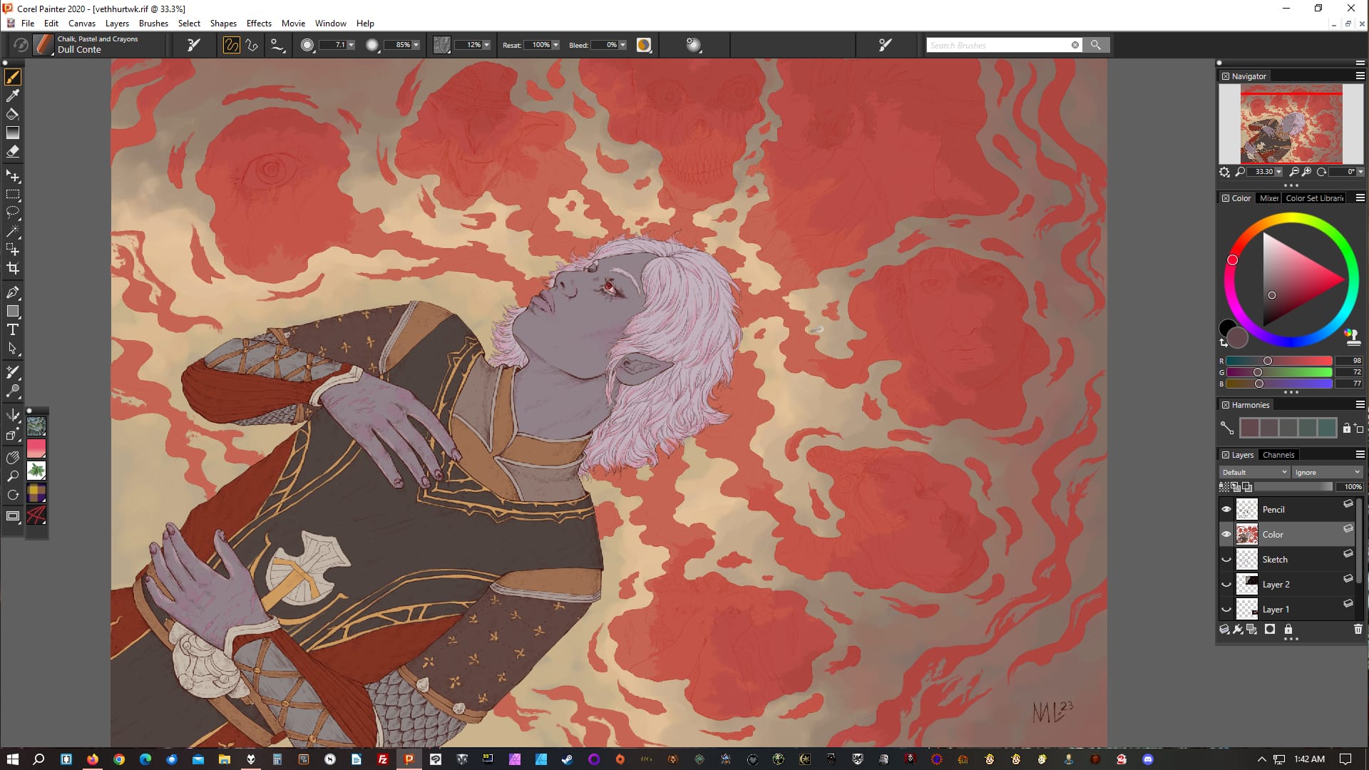 This drawing of Vethryn is at a typical first rendering session end point: his face and hair is done, as is his hand (I have the blood layer off for now), but I've yet to get to anything else.Similarly for the one of Ithenrael here; face and hair done, hands done (I usually do all visible skin at once), nothing else.A bit further on into rendering, in addition to Vethryn's face, skin, and hair, I've also done the leather bits on his armor. I tend to go more by "type of thing" than "section of image".At this point Ithenrael himself is done, but I haven't started in on the blood ocean or blood wave yet. Another common stopping point.Similarly, at this point Vethryn is done, but I haven't begun on the background yet. I didn't take a screenshot of that part of the process; unfortunately for this post, I often don't, because it's the last.I actually worked on the background first in this one of Earilin (one of my MERP characters), so that's a background example. Usually I would have done this last; I don't know why I did it differently here.