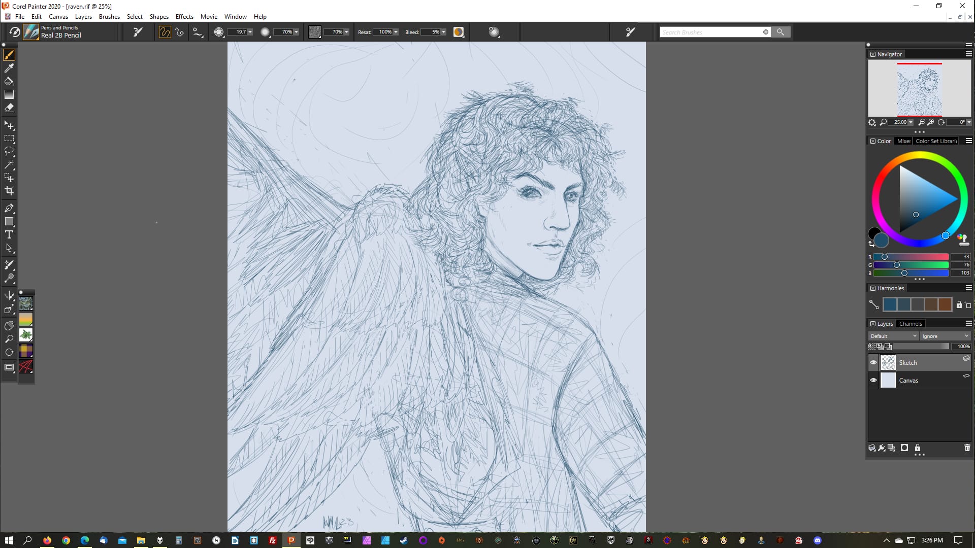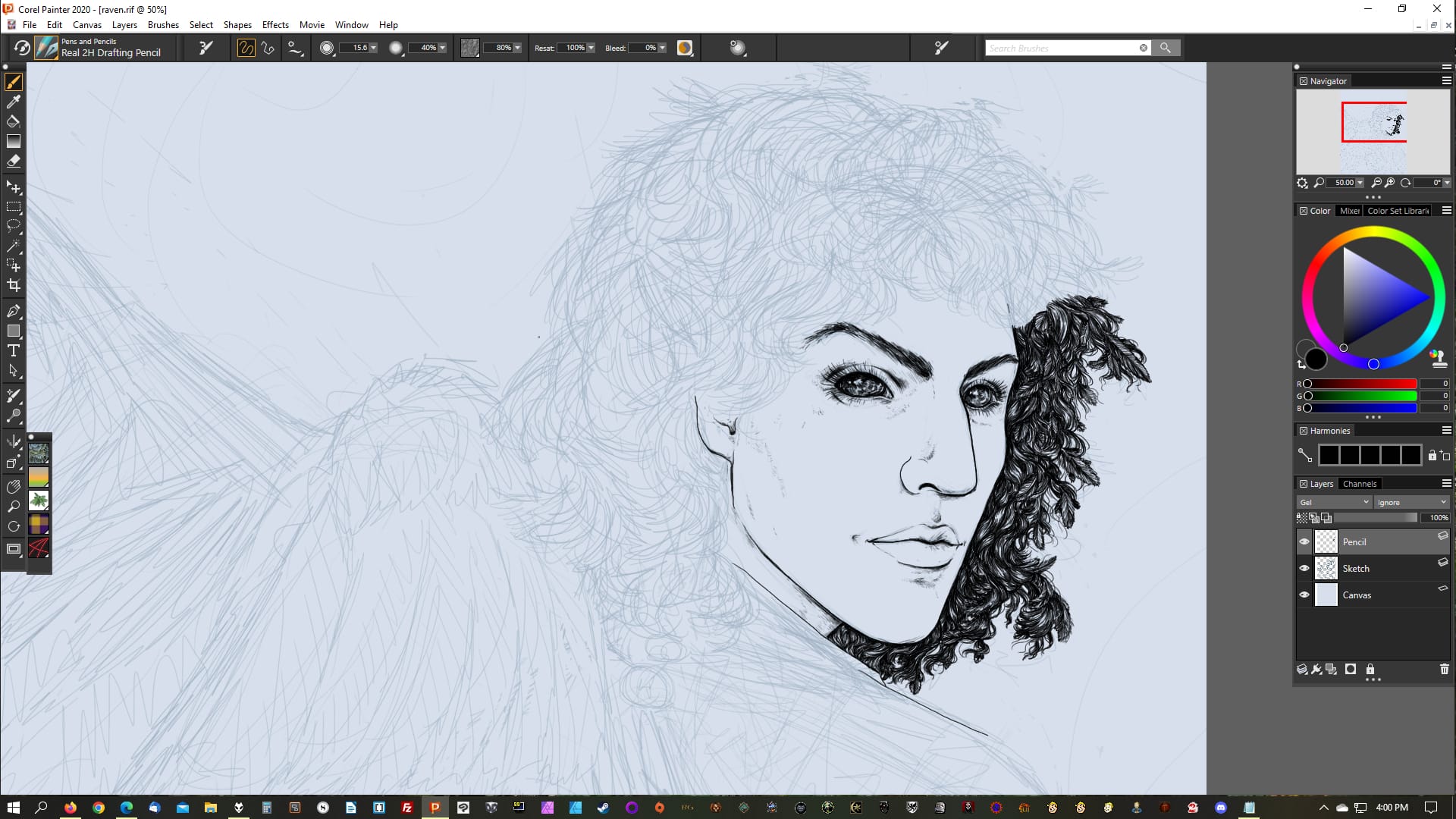 From the drawing of Raven, this is after the first session working on lines. I was working on this just after recovering from surgery so I was going a little slower than I usually do, but it's indicative of the process. (I also took more screenshots than usual, so that's why I'm using this one.)