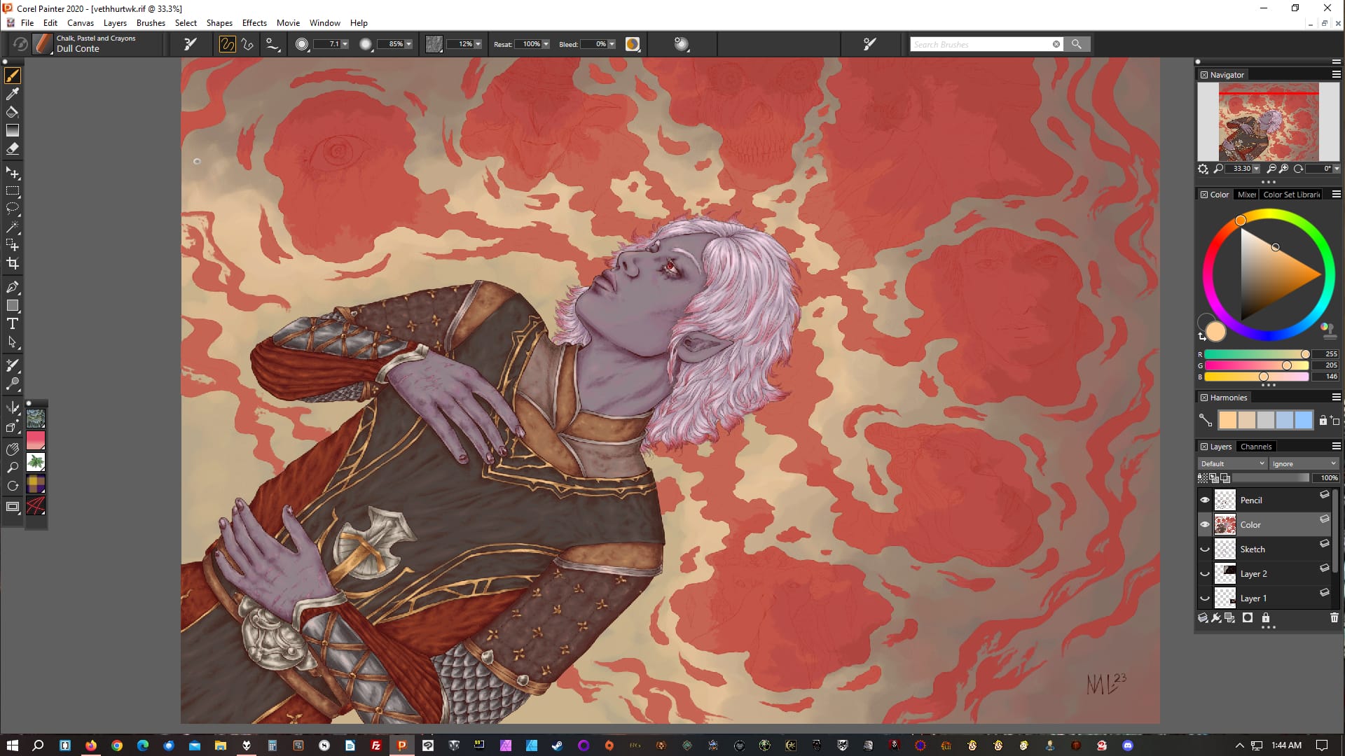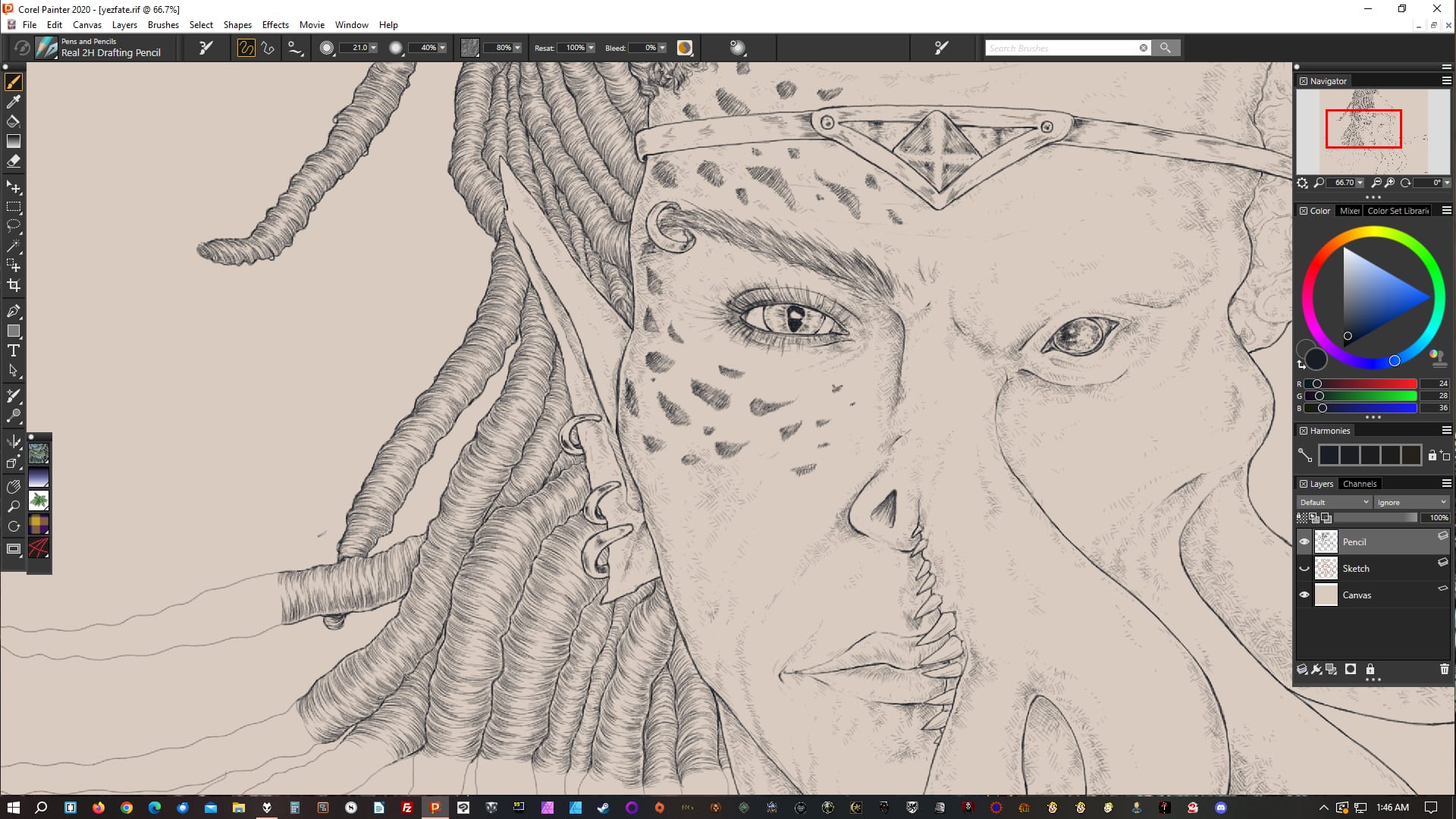 This drawing of Vethryn went much faster, this screenshot also being after the first session working on the lines. There are a few reasons for that: his hair is white, not black and feathery, so there are less lines in there, and there wasn't anything physically slowing me down. But I often end up with face + head + outlines of the next thing to work on after the first line session.