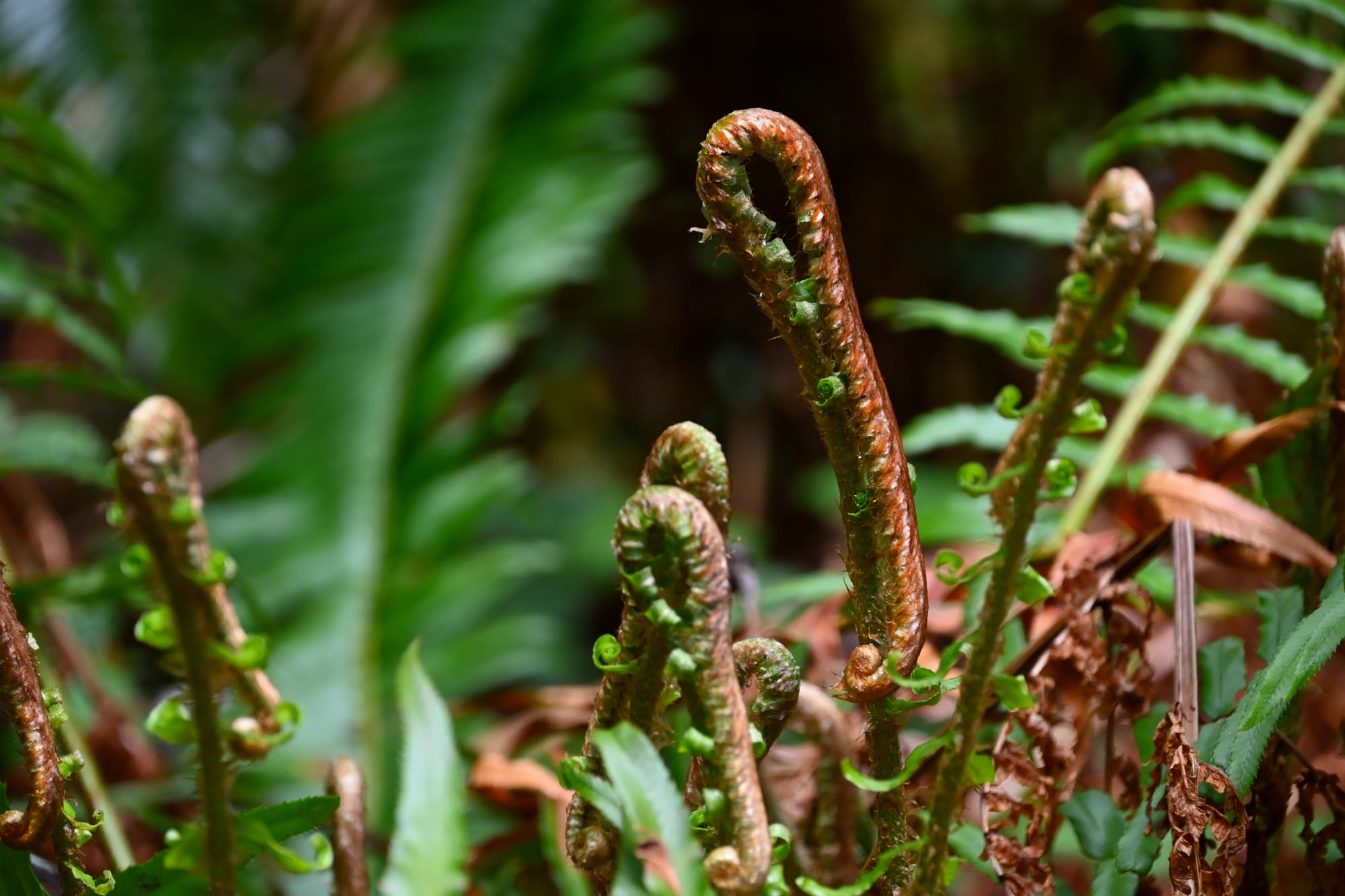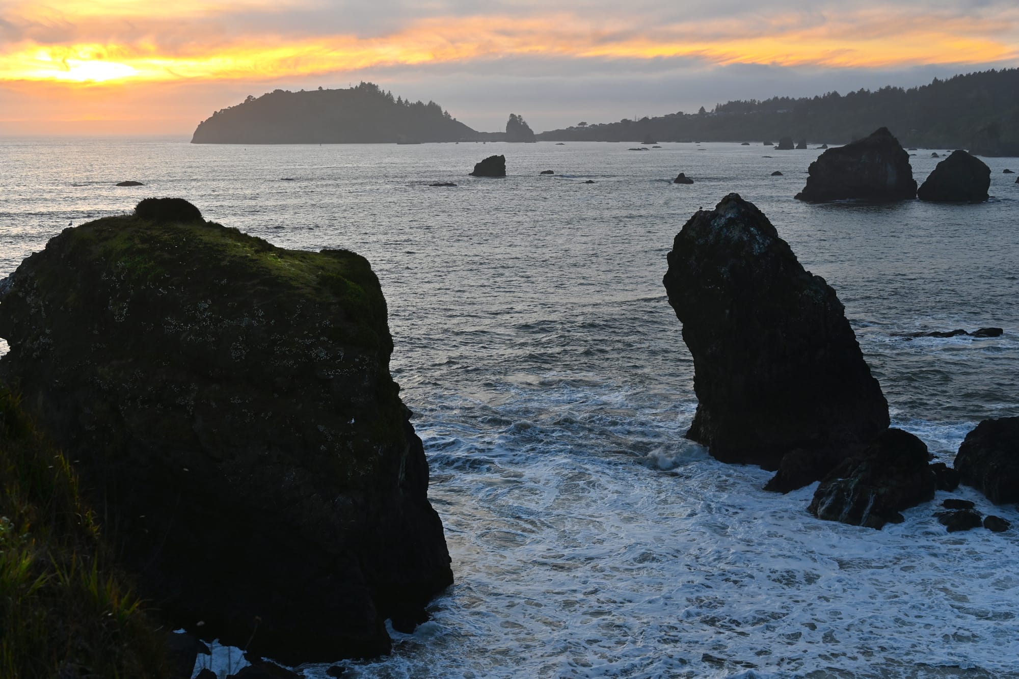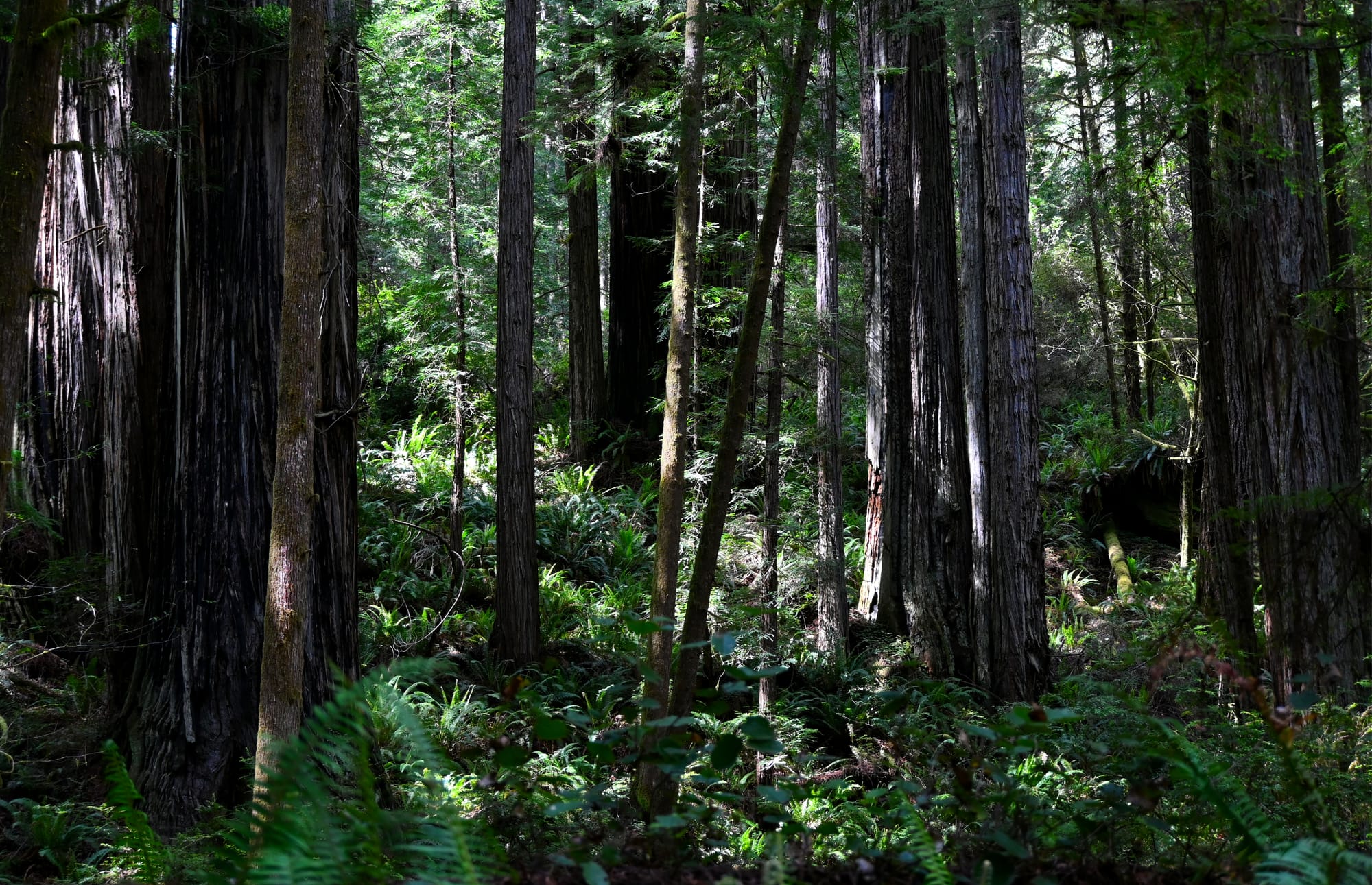 Sunset at Tepona Point, my only sunset of the trip (I was coming down with a nasty head cold that evening, but the view was good)Marching redwoods in the Rockefeller Grove, with less bright conditionsThe slopes of the Atlas Grove at Prairie Creek State Park; sunlight was aggressive again that day, but the forest provided shadeFerns in Prairie Creek State ParkFerns in Prairie Creek State Park