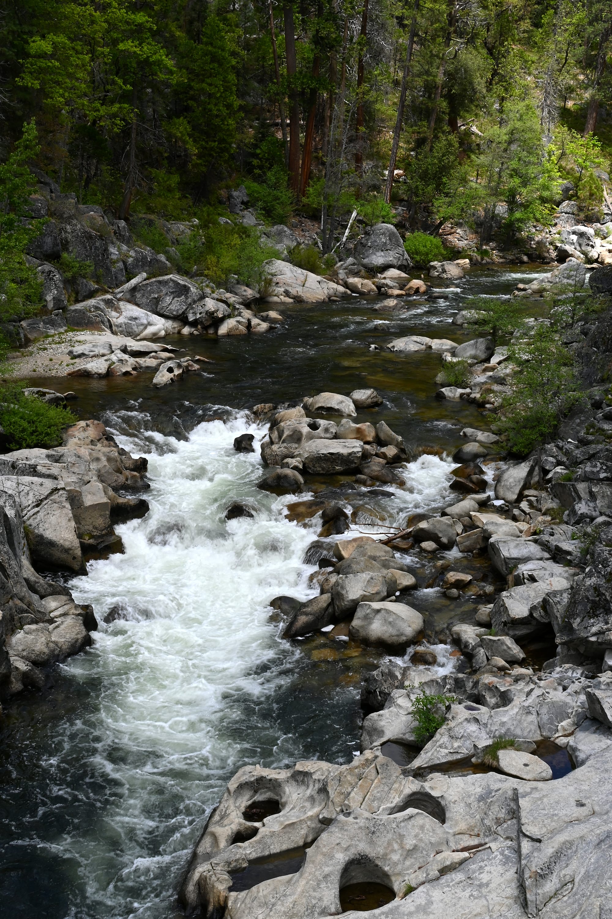 Two near giant sequoias frame two farther ones, as well as a tall pine tree which provides scale; this day was also too bright to be good for photography, but providing a sense of the sequoia's immensity proved tricky elsewhereRapids on the Stanislaus River; I had not taken my tripod on this hike and wish I had, but I still like how this turned out