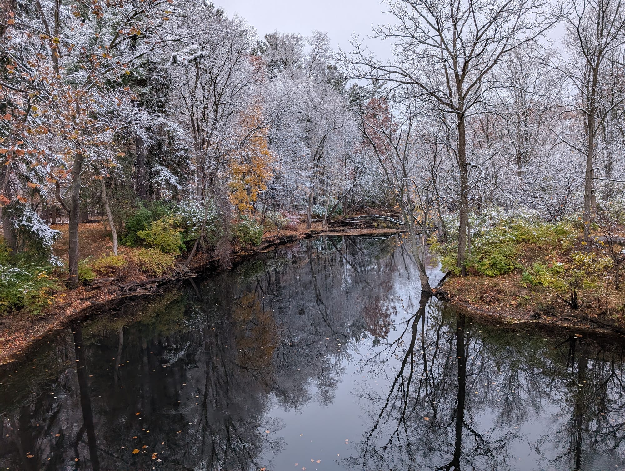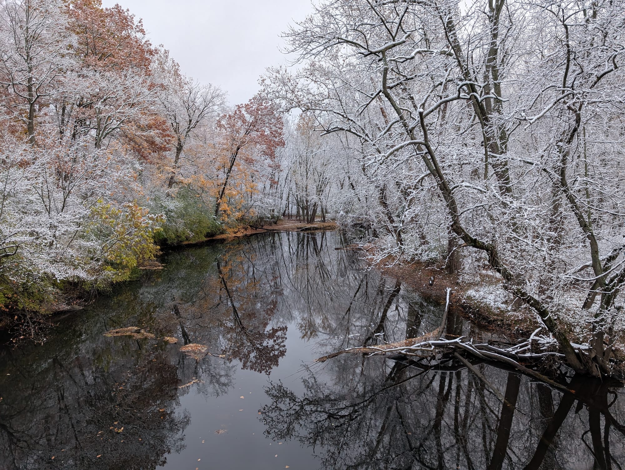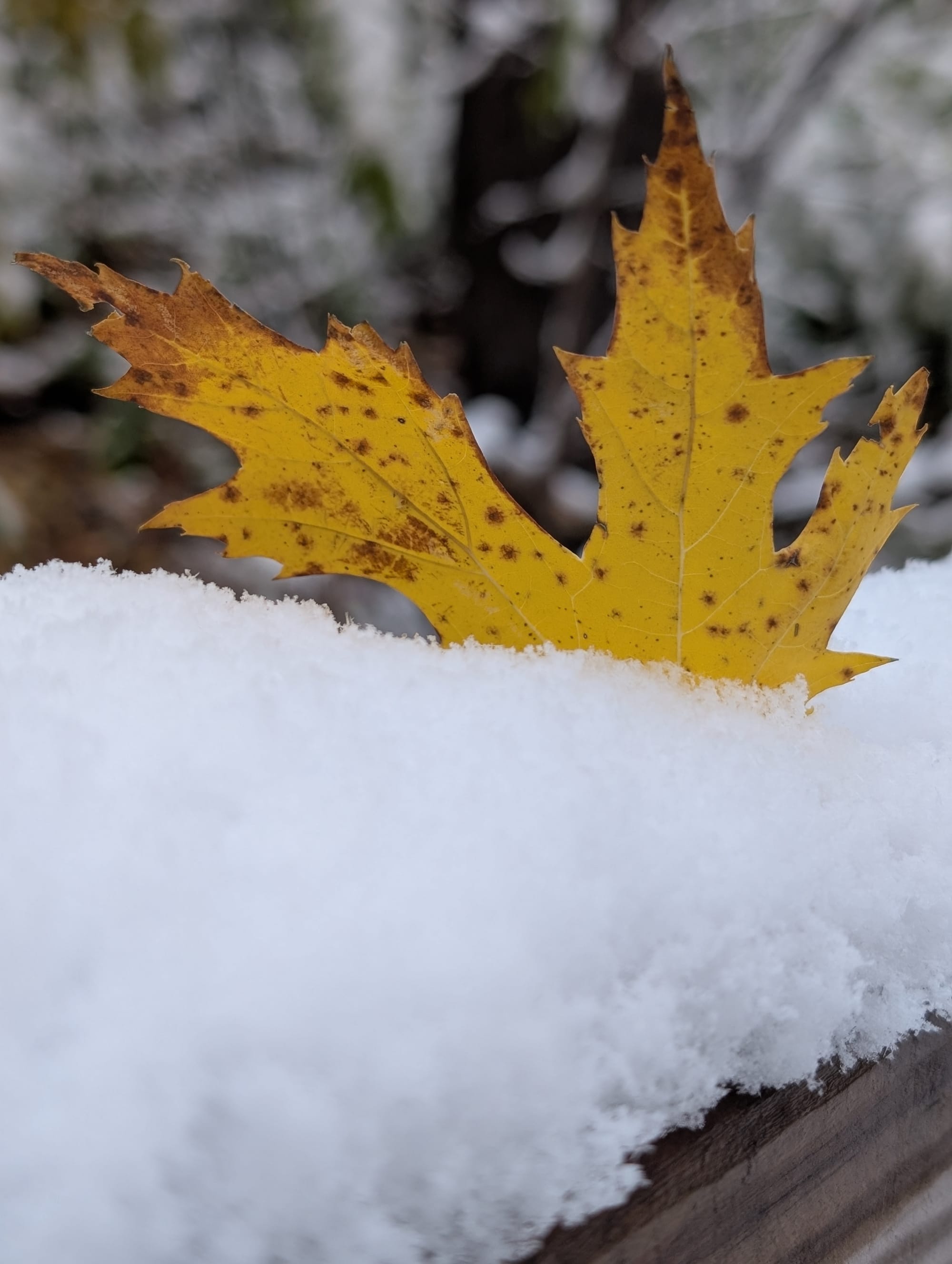 Nothing with the big camera lately; I took a few photos of the first snow on the not-yet-fallen leaves while I was back in East Lansing for longer than planned: