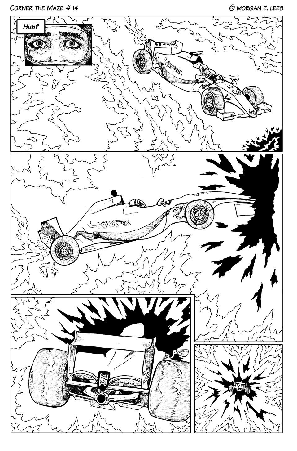 At this point I'd switched to a dip pen and ink from markers, and I was doing the panel borders by hand instead of adding them in Photoshop, but the paneling here is also much livelier. One of the big panels is borderless, and there are several smaller ones that have more of a purpose to them.