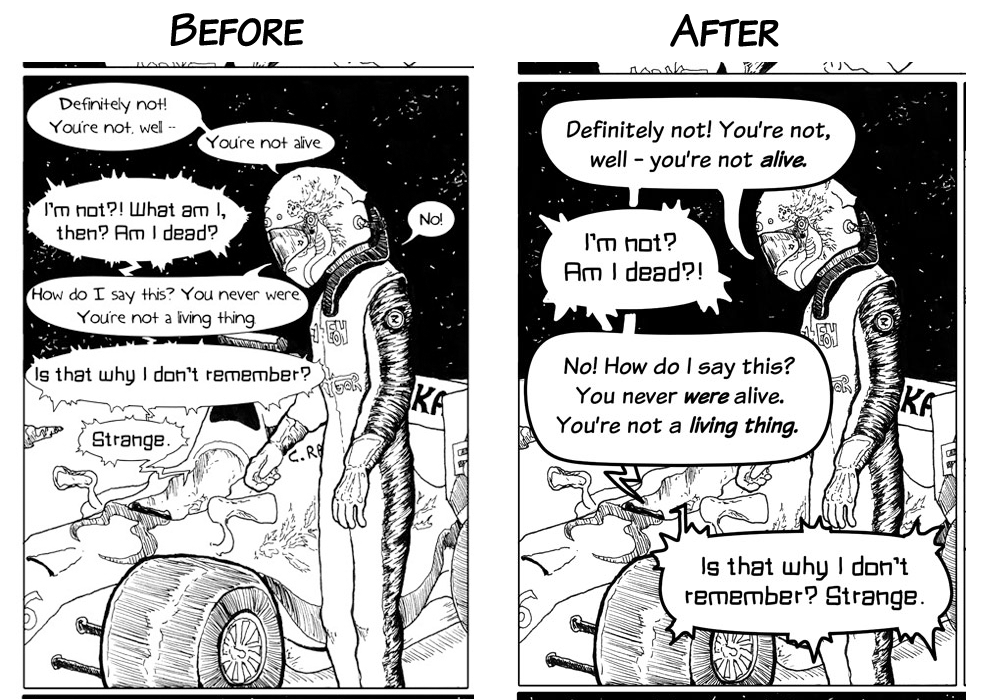 This would be a good time to talk about lettering again. You see that nice, neat, readable font? Well, it wasn't original to that page. In fact, it wasn't until after several months of comic making it was pointed out to me how huge a problem legibility was for my comic that I changed the original font. Here's a comparison I put together at the time: